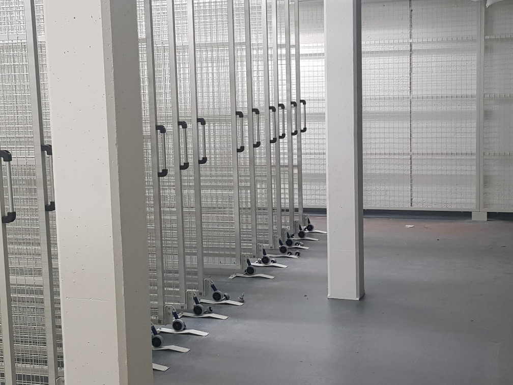 This installation comprises of 40m of wall fixed Artestore Mesh Picture Racks 2m high for the storage of temporary artwork collections and 7 blocks of Artestore Penda pull out picture racks which operate by pull out painting frames suspended from existing steel supports consisting of overhead tracks and mesh frames.